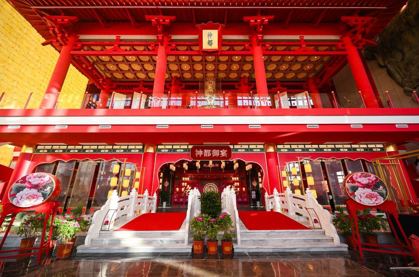 综合楼内,同样包含大气象——中央大殿复刻朝堂氛围,顶部七彩祥云层叠,光影交织满溢祥瑞,唐三彩与牡丹文化交相辉映,千年风雅流转于飞檐斗拱间。尤其是二层的“龙椅卡位”汉服打卡,可以让游客体验君临天下。